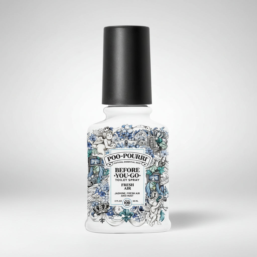 Poo~Pourri Fresh Air 2oz Toilet Spray – The before-you-go bathroom deodorizer that stops odors at the source.Simply spray the bowl before you go, and our proprietary blend of essential oils creates a protective barrier on the water's surface, trapping odors below. What you leave behind is a refreshing, clean scent and a more pleasant bathroom experience for everyone.